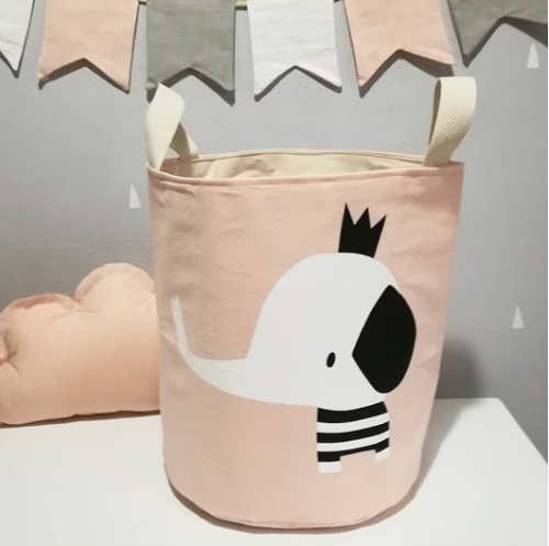 Canasto de guardado o para trasladar, realizado en tussor estampado en serigrafía,