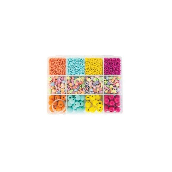 Medida: 17x13x4.5 cm. Viene con mostacillas de vidrio, plástico con formitas, madera de colores y tanza, para armar tus propias joyas!