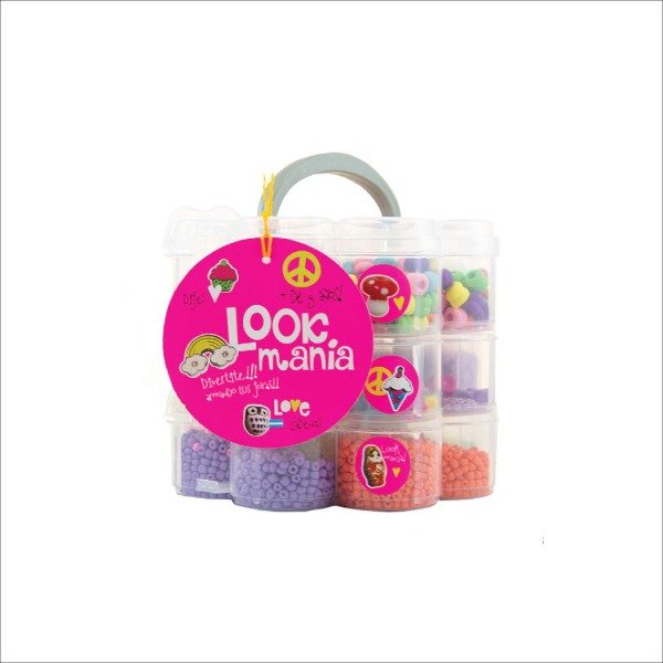 Viene con tanza, mostacillas de plástico, madera y vidrio.