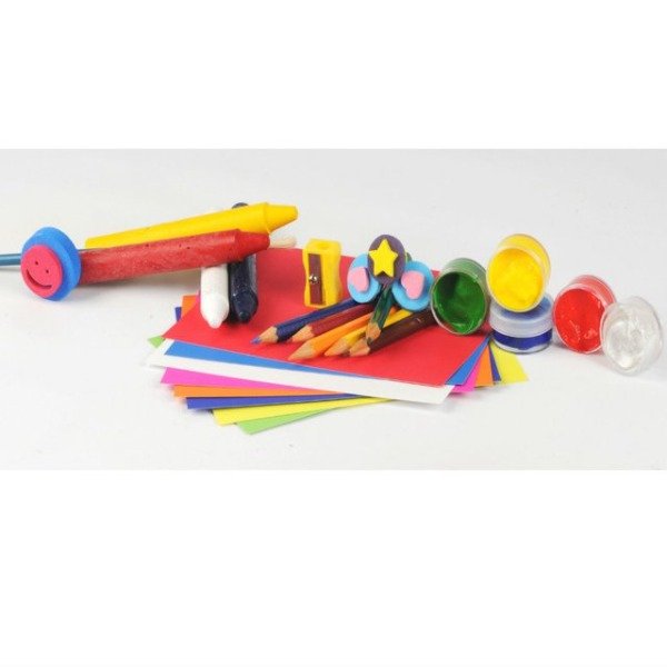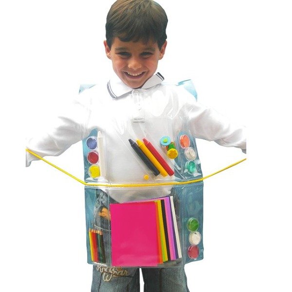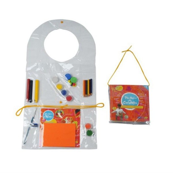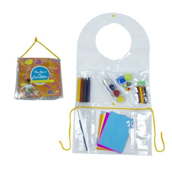 Es un bolso de plástico que se desarma y se transforma en un pintorcito, con un montón de materiales de arte para crear y diseñar tus propias tarjetas originales.