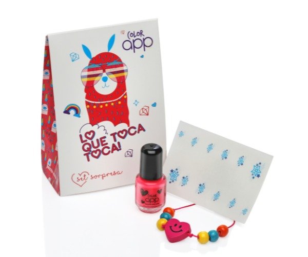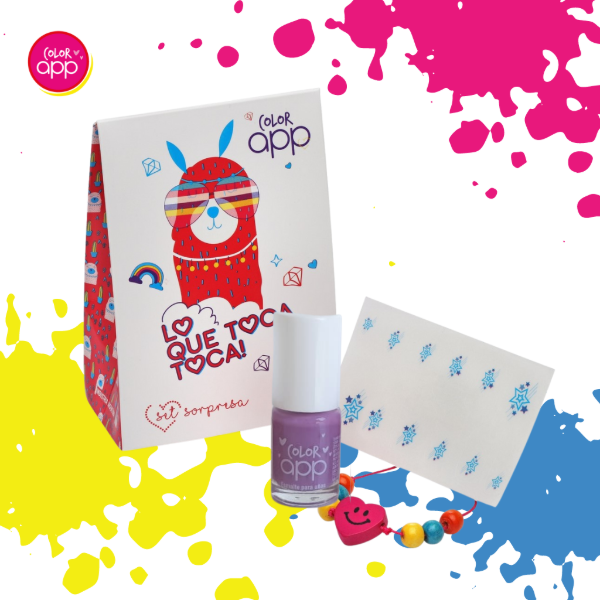 Cajita con esmalte, tatuaje para uñas o apliques brillantes y sorpresa para armar.