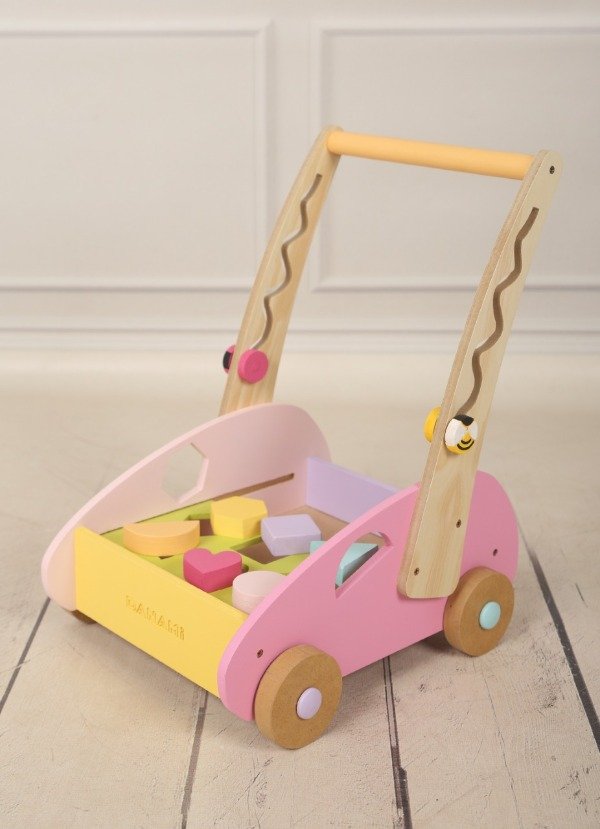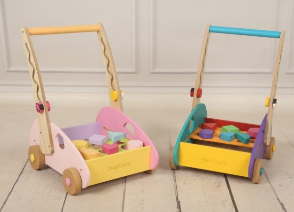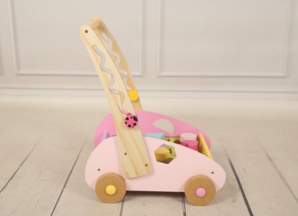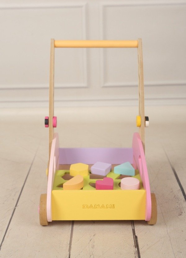 Carro caminador: 4 ruedas, manubrio, cajón portaobjetos con juego didáctico en los laterales.