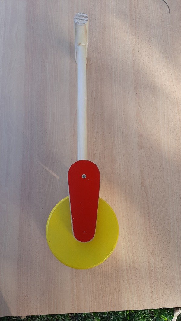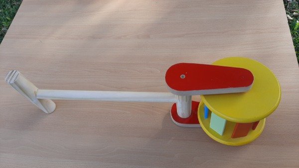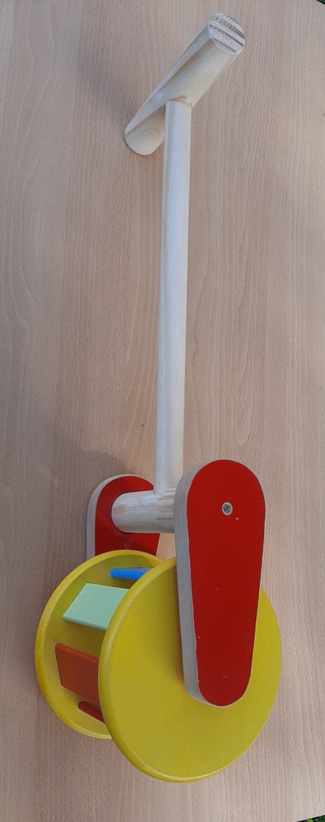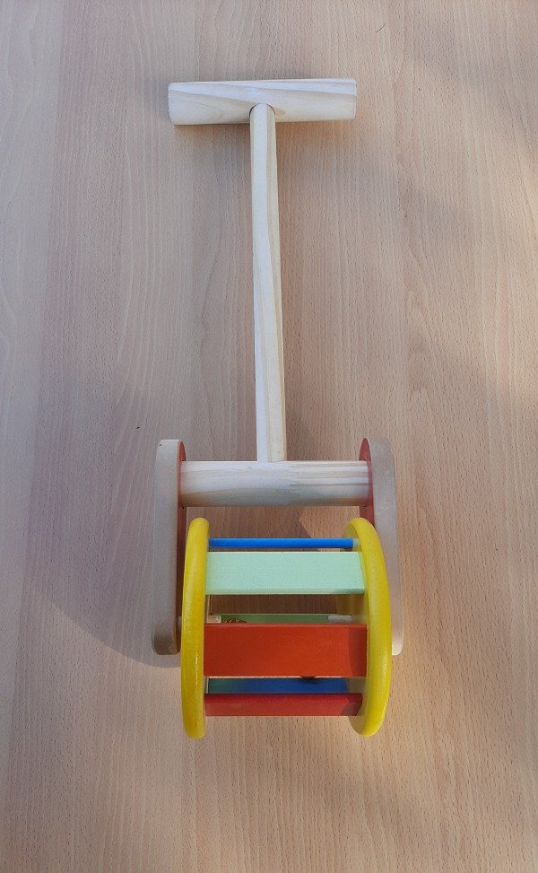 A medida que lxs niñxs lo van moviendo sus colores giran y genera un hermoso sonido de cascabel y madera